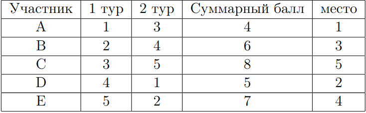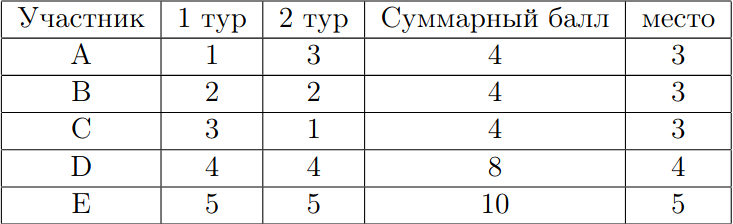 Пусть по результатам первого тура участник А занял место \(x\), а по результатам второго — \(y\). Тогда суммарным баллом участника А считается сумма \(x + y\). Итоговое место А определяется как количество участников (включая А), у которых суммарный балл не превосходит суммарный балл А. Обратите внимание, что таким образом некоторые участники могут делить места между собой. Также важно заметить, что и в первом, и во втором туре никакие два участника не поделили место, таким образом для каждого \(i\) от \(1\) до \(n\) ровно один участник занял \(i\)-е место в первом и ровно один участник занял \(i\)-е место во втором туре.