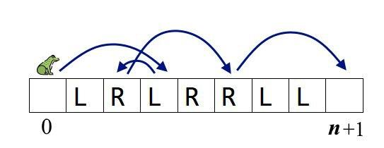 Слева от строки \(s = s_1 s_2 \ldots s_n\), состоящей из \(n\) символов, находится лягушка (точнее, изначально лягушка находится в клетке \(0\)). Каждый символ строки \(s\) — это или 'L', или 'R'. Это значит, что если лягушка находится в \(i\)-й клетке и \(i\)-й символ — это 'L', то она может прыгать только влево. Если лягушка стоит в \(i\)-й клетке и \(i\)-й символ — это 'R', то она может прыгать только вправо. Из клетки \(0\) лягушка может прыгать только вправо.
