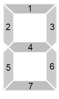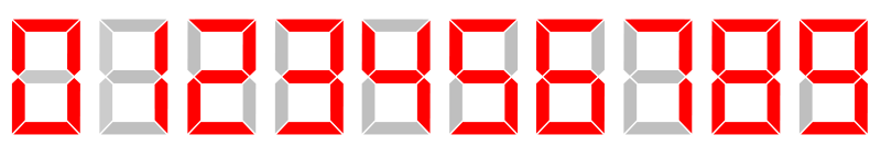 Как же сильно расстроился бедный парень. Так сильно, что он пнул какое-то табло с цифрами. Цифры отображаются таким же образом, как на электронных часах: каждая позиция для цифры состоит из \(7\) сегментов, которые могут быть включены или выключены, чтобы отображать различные цифры. На картинке показано, как изображаются все \(10\) десятичных цифр: