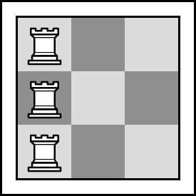 Один из способов расставить ладьи при \(n = 3\) и \(k = 2\) Два способа считаются различными, если существует хотя бы одна клетка, которая свободна в одном из способов и занята ладьей в другом способе.