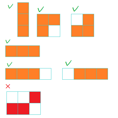 Всего есть \(6\) возможных раскрасок, которые изображены на рисунке, но среди них есть только \(4\) различные формы. Поэтому, ответ равен \(4\). Обратите внимание, что последний пример на картинке это некорректная раскраска, потому что не все клетки связны по сторонам.