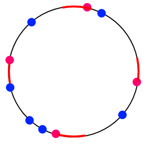 Схематичный пример корректного способа запустить электрички. Здесь \(h=2\) (следовательно, количество электричек равно \(2h=4\)), количество поездов \(n=6\). Электрички обозначены красным цветом (обратите внимание, что промежутки между ними одинаковы). Поезда обозначены синим цветом. Отрезки времени длины \(k\) до каждой электрички выделены красным. Обратите внимание, что внутри этих отрезков нет поездов. Разумеется, не всегда можно составить корректное расписание электричек вместе со всеми товарными поездами. Тогда необходимо отменить некоторые товарные поезда, чтобы появилась возможность пустить электрички с соблюдением всех транспортных норм. Найдите такое время \(t\) для запуска первой электрички, чтобы количество товарных поездов, которые потребуется отменить, было минимальным.