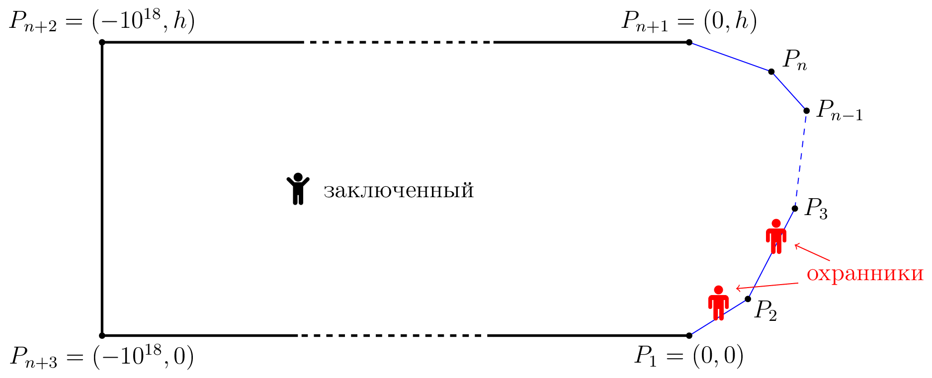 Если заключенный достигает точки на периметре, где есть охранник, охранник убивает заключенного. Если заключенный достигает точки, на которую он может взобраться, и там нет охранника, то он сразу же убегает. Изначально заключенный находится в точке \((-10^{17}, h/2)\), а охранники — в точке \(P_1\).