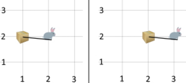 Например, если коробка находится в точке \((1,2)\), и кролик находится в точке \((2,2)\), он может передвинуть коробку вправо на \(1\), поместив коробку в точку \((2,2)\). Сам кролик переместится в точку \((3,2)\).