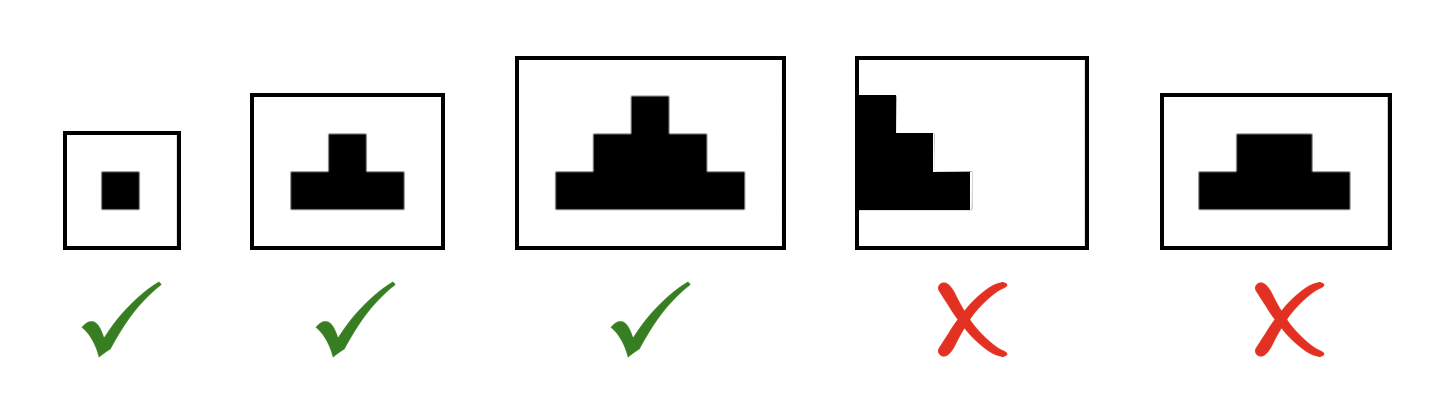 - Для всех \(1 \le i \le k\) все ячейки с номером строки \(x+i-1\) и с номерами столбцов в диапазоне \([y - i + 1, y + i - 1]\) должны принадлежать набору. Все остальные ячейки не могут принадлежать набору.
