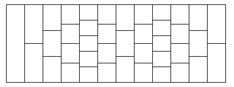 Рассмотрим дорогу, состоящую из нескольких рядов. Каждый ряд разделен на несколько прямоугольных плиток, и все плитки в одном ряду одинаковы. Первый ряд содержит ровно одну прямоугольную плитку. Посмотрите на рисунок ниже, который показывает, как расположены плитки.