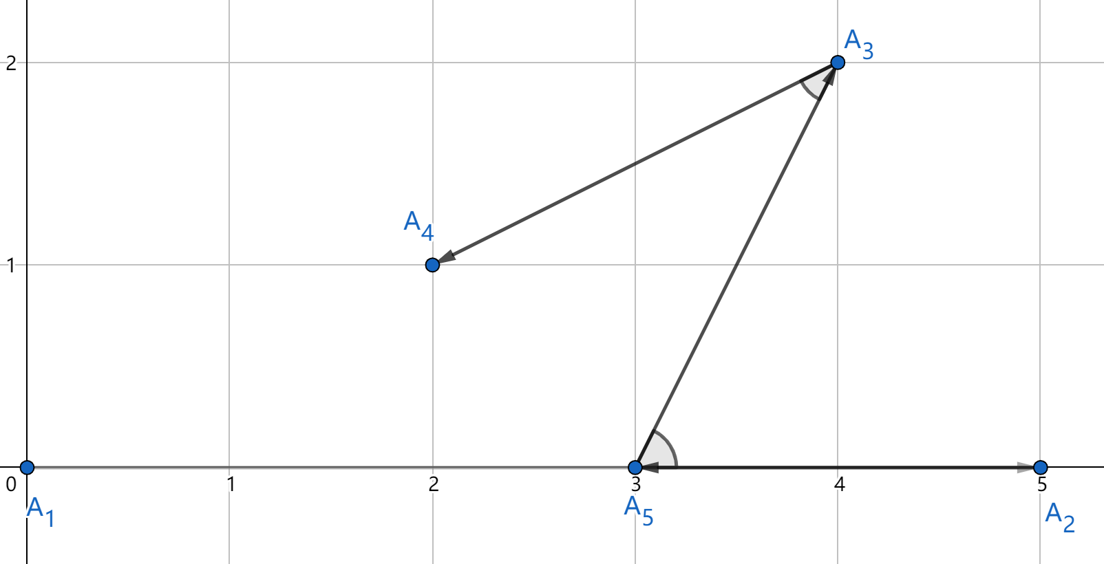 Обратите внимание, что угол между \(A_1\), \(A_2\) и \(A_5\) с центром в \(A_2\) равен \(0\) градусов. Однако угол между \(A_1\), \(A_5\) и \(A_2\) с центром в \(A_5\) равен \(180\) градусам.