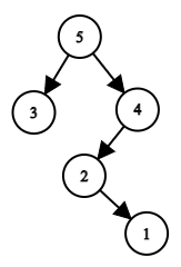 Например, если он строит дерево по перестановке \(a=[3, 5, 2, 1, 4]\), то корнем будет элемент \(a_2=5\), левым поддеревом будет дерево, которое будет построено для подмассива \(a[1 \dots 1] = [3]\), а правым — для подмассива \(a[3 \dots 5] = [2, 1, 4]\). В итоге будет построено следующее дерево: