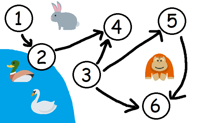 Бесконечный Зоопарк может быть представлен графом с бесконечным числом вершин, обозначенных \(1,2,3,\ldots\). От вершины \(u\) до вершины \(u+v\) существует ориентированное ребро, если и только если \(u\&v=v\), где \(\&\) обозначает операцию побитового И. Других ребер в графе нет.