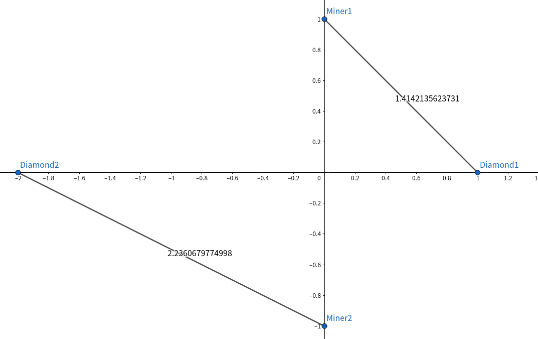 В первом примере есть два шахтера в точках \((0,1)\) и \((0,-1)\), а алмазы расположены в точках \((1,0)\) и \((-2,0)\). Если распределить алмазы по шахтерам, как показано на рисунке, то потратится \(\sqrt2 + \sqrt5\) единиц энергии.