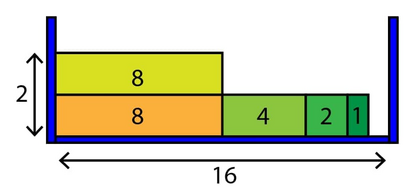 На этой картинке число внутри каждого прямоугольника — это его ширина. Ширина коробки равна \(16\) (см. обозначения в нижней части картинки). Минимальная высота коробки равна \(2\) (см. обозначения в левой части картинки).