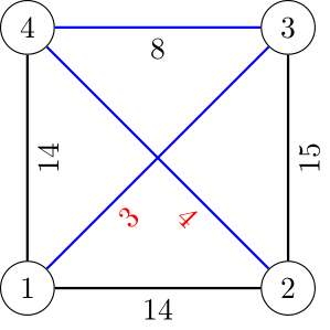 На изображении ниже показан первый пример. Черные веса назначены предварительно, красные веса назначены нами, а минимальное остовное дерево состоит из синих ребер.