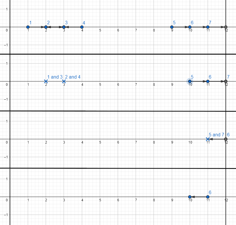 Обратите внимание, что роботы \(2\) и \(3\) не сталкиваются, потому что они встречаются в одной точке \(2.5\), которая не является целой.