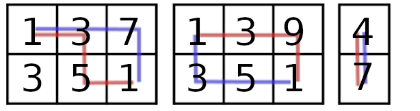 - Пойти вниз — из некоторой ячейки \((x, y)\) в \((x + 1, y)\).