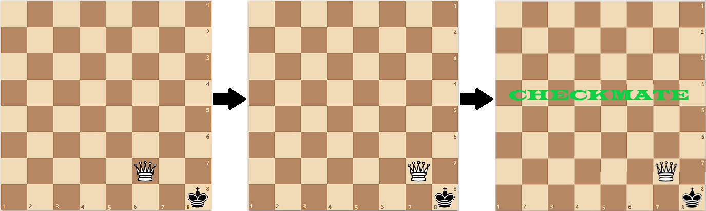 Вы выигрываете, если у короля нет доступных ходов. Вы проигрываете после \(130\) ходов ферзя, если король имеет доступный ход.
