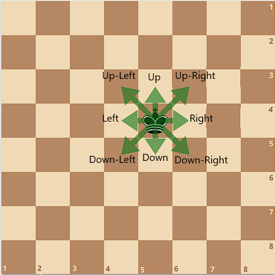 За один ход король может переместиться «Вправо», «Влево», «Вверх», «Вниз», «Вниз-Вправо», «Вниз-Влево», «Вверх-Влево», или «Вверх-Вправо» так, чтобы оставаться на доске. Король не может ходить в клетку, находящуюся на одной горизонтали, вертикали или диагонали с ферзем (включая клетку, где стоит ферзь). Например, если король был на клетке (\(4\), \(5\)), он может сходить в (\(4+k_1\), \(5+k_2\)) где (\(-1 \le k_1,k_2 \le 1\), \((k_1, k_2) \ne (0, 0)\)).