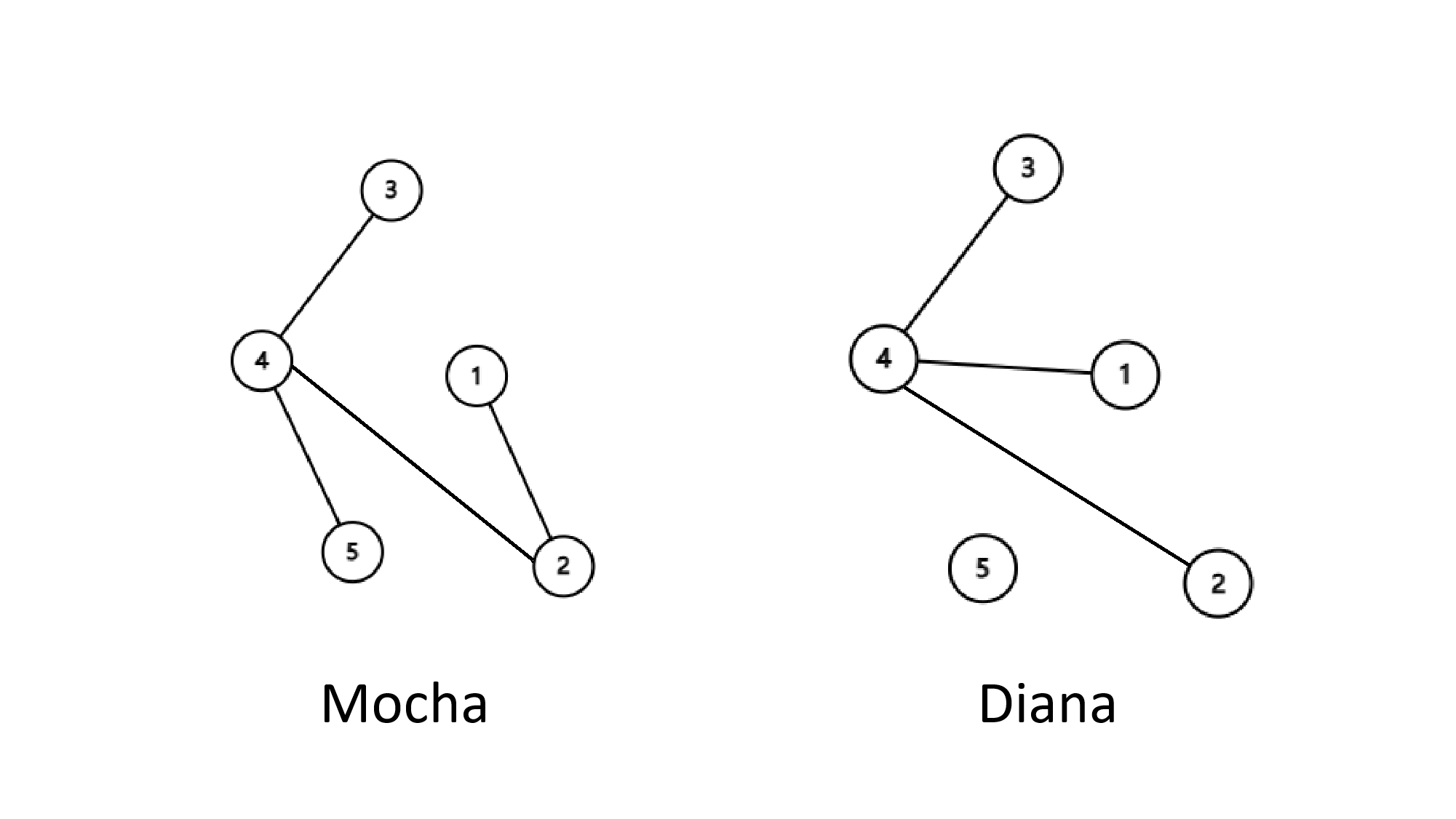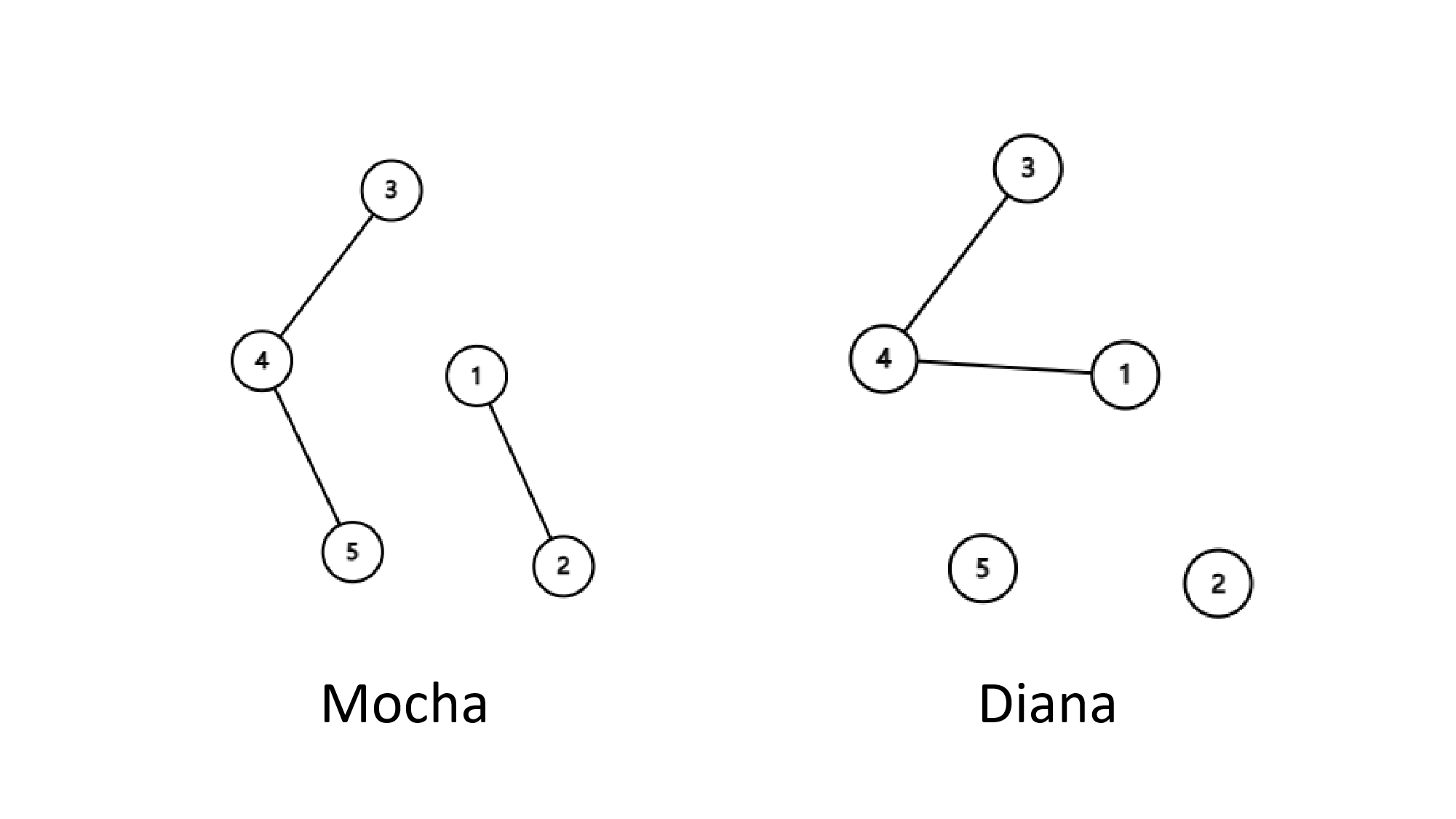- Они добавляют одинаковые ребра. Это значит, что если ребро \((u, v)\) добавляется в лес Mocha, то также ребро \((u, v)\) добавляется в лес Diana, и наоборот.