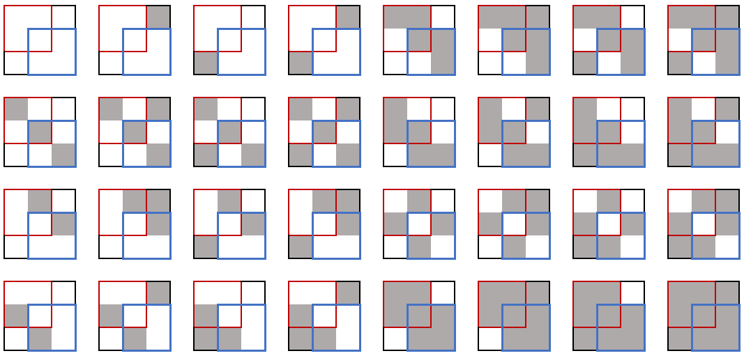 The following are all \(32\) possible color combinations in the first example.