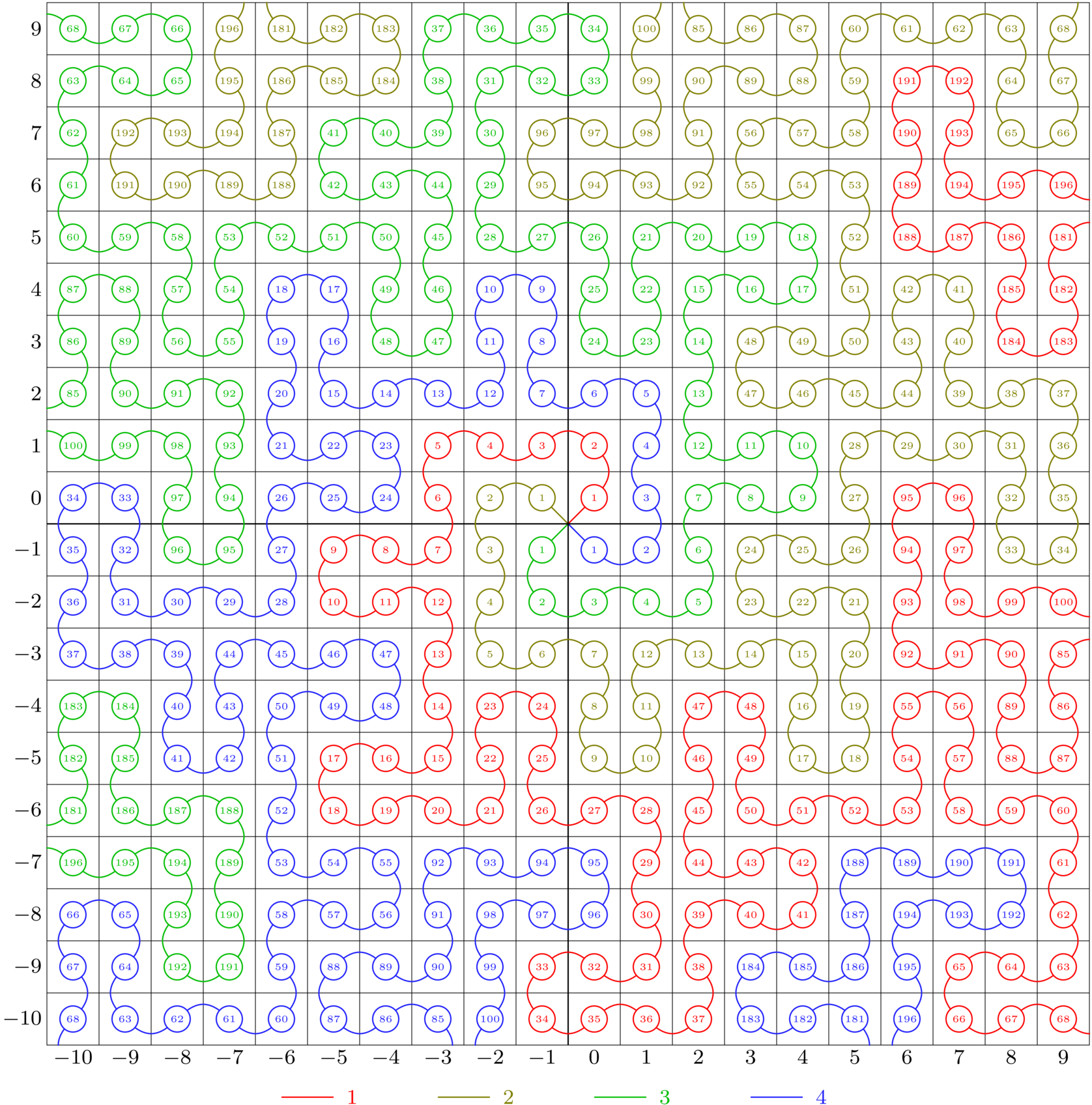 Given a point \((x,y)\), your task is to find on which of the four curves lies the segment passing through the square with the opposite corners at \((x,y)\) and \((x+1,y+1)\), as well as the position of that segment on that curve. The curves are numbered \(1\) through \(4\). Curve \(1\) goes through \((1,1)\), \(2\) through \((-1,1)\), \(3\) through \((-1,-1)\), and \(4\) through \((1,-1)\). The segments are numbered starting with \(1\).