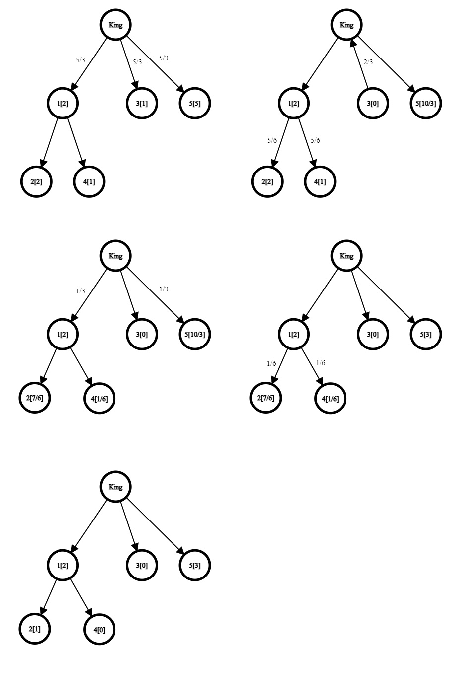 Lord \(1\) will split the money equally between his vassals — \(2\) and \(4\), with each receiving \(\frac{5}{6}\). Lord \(5\) will keep the money (having no vassals). Lord \(3\) will keep \(1\) unit of money, and give the remaining \(\frac{2}{3}\) to the king. The king will then split the \(\frac{2}{3}\) between the vassals with unmet needs — \(1\) and \(5\), passing \(\frac{1}{3}\) to each. Lord \(5\) will keep the extra cash (now having a total of \(2\), still not enough to meet his needs). Lord \(1\) will split it equally between his vassals, and the extra \(\frac{1}{6}\) will be enough to meet the needs of lord \(4\).