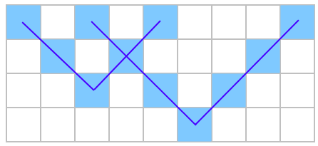 Поле в четвертом наборе данных из примера могло быть получено рисованием двух галочек размеров \(1\) и \(2\). Их вершины отмечены ниже \(\color{blue}{\text{синим}}\) и \(\color{red}{\text{красным}}\) цветами соответственно: