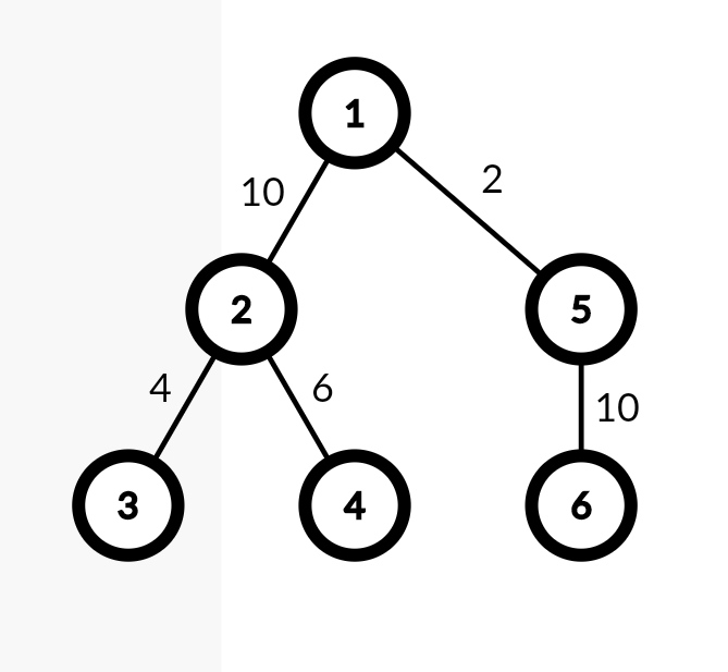 В \(i\)-й из следующих \(n-1\) строк должно содержаться три целых числа \(u_i\), \(v_i\), \(w_i\) (\(1 \le u_i, v_i \le n\), \(u_i\ne v_i\), \(1 \le w \le 10^9\)), что означает, что между вершинами \(u_i\) и \(v_i\) есть ребро с весом \(w_i\).