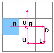 Задача робота — выполнить как можно больше команд, не упав с доски. Например, на доске \(3 \times 3\), начав исполнять последовательность действий \(s=\)«RRDLUU» («вправо», «вправо», «вниз», «влево», «вверх», «вверх») из центральной клетки, робот выполнит одну команду, после чего следующей командой выйдет за границу доски. Если же робот начнет движение из клетки \((2, 1)\) (вторая строка, первый столбец), то все команды будут успешно выполнены, и робот остановится в клетке \((1, 2)\) (первая строка, второй столбец).