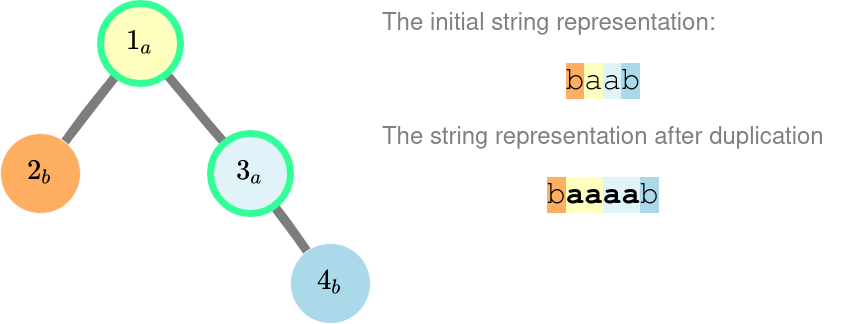 Ниже находится дерево для первого примера. Мы продублировали строки в вершинах \(1\) и \(3\). Строку в вершине \(2\) не нужно дублировать, так как в таком случае представление будет «bbaaab», что лексикографически больше, чем «baaaab».