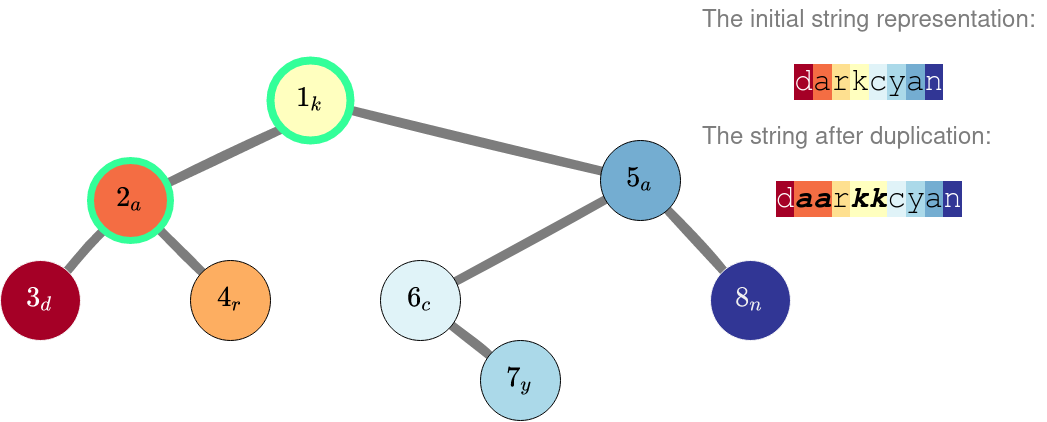 Рисунке ниже иллюстрируют примеры. Число в вершине обозначает номер вершины, а строка в нижнем индексе — строку, написанную в вершине. Справа находится строковое представление дерева, где каждая буква имеет цвет соответствующей вершине дерева.