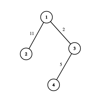 Рассмотрим граф ниже. Он является простым деревом, так как вес любого пути из не более чем двух ребер простой. Например, путь из двух ребер \(2 \to 1 \to 3\) имеет вес \(11 + 2 = 13\), который является простым числом. Другой пример, путь из одного ребра \(4 \to 3\) имеет вес \(5\), который является простым числом.