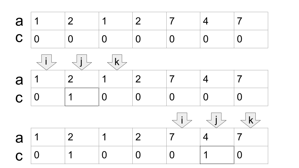 - Выбрать три элемента \(i\), \(j\) и \(k\) (\(1 \leq i < j < k \leq n\)) такие, что \(c_i\), \(c_j\) и \(c_k\) равны \(0\) и \(a_i = a_k\), и затем присвоить \(c_j = 1\).