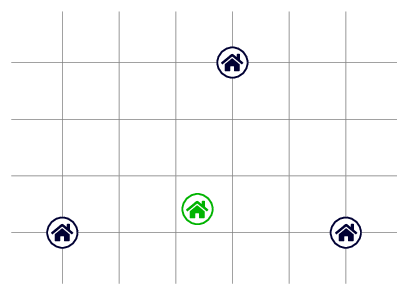 In the first sample, Fabio, Flavio and Francesco live at the points with coordinates \((0,0)\), \((5,0)\) and \((3,3)\) respectively. The optimal place of residence, represented by a green house in the picture below, is at the point with coordinates \((2.3842..., 0.4151...)\).