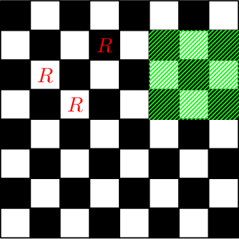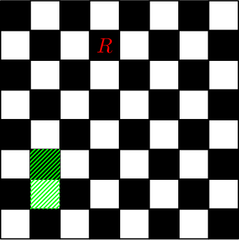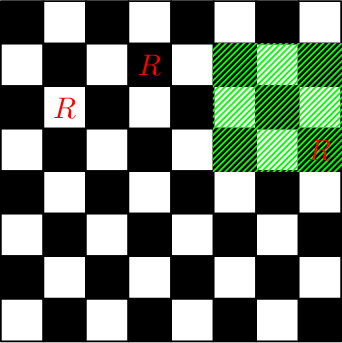 Рассмотрим пример. После первых двух запросов доска будет выглядеть следующим образом (буквой \(R\) обозначены клетки, в которых находится ладья, а зеленым выделен прямоугольник запроса третьего типа):