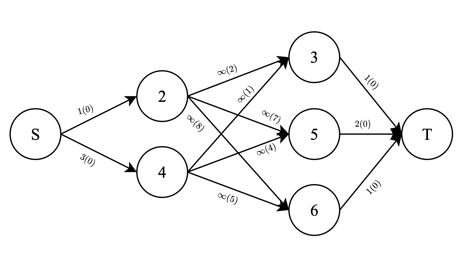В первом запросе, максимально возможный поток составляет \(1\), т.е. одна единица из источника в \(2\), затем одна единица из \(2\) в \(3\), затем одна единица из \(3\) в сток. Стоимость потока равна \(0 \cdot 1 + |2 - 4| \cdot 1 + 0 \cdot 1 = 2\).