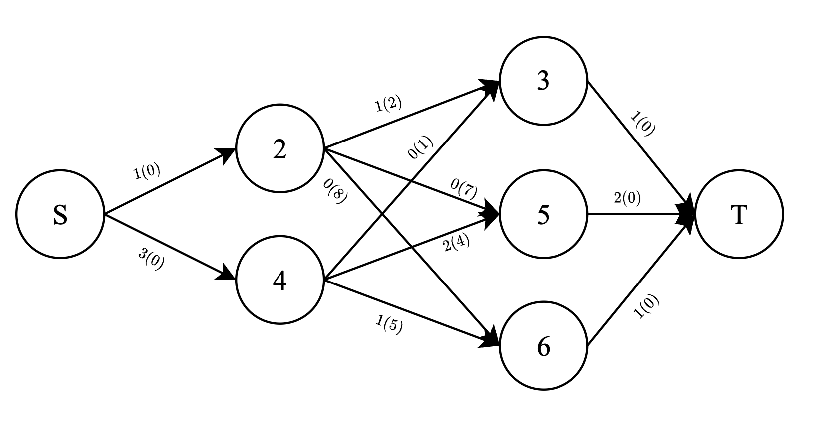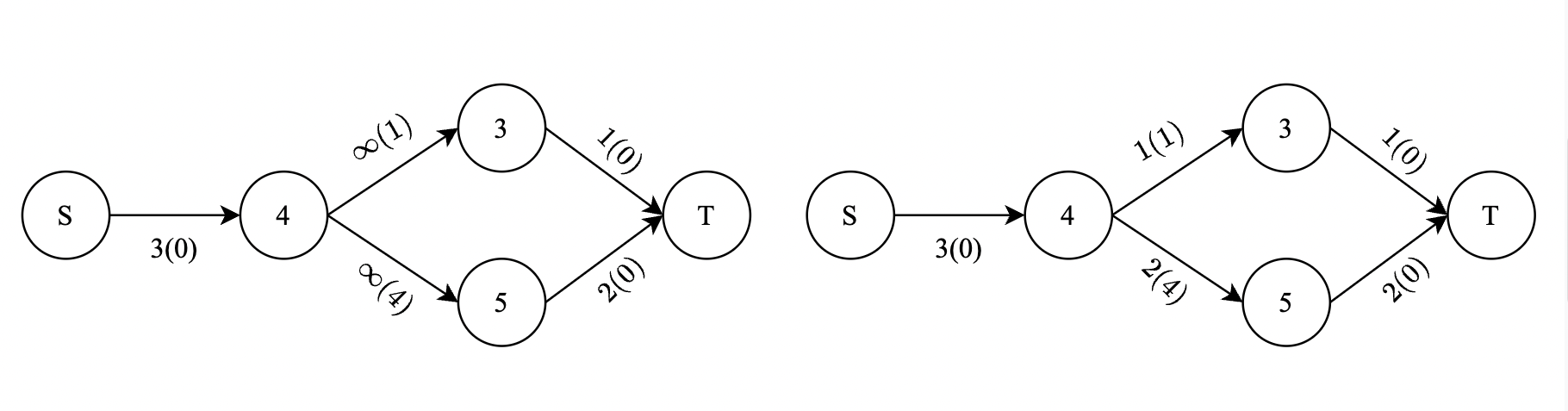 В третьем запросе, граф показан слева с пропускной способностью, указанной вне скобок, и стоимостью, указанной в скобках. Изображение справа показывает поток через каждое ребро в оптимальной конфигурации.