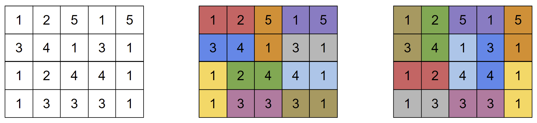 Они оба решили головоломку и сравнили свои ответы, но заметили, что их решения не только не совпадают, но ни одна из \(n\) доминошек не находится в одном и том же месте в обоих решениях! Формально, если в решении Поликарпа две ячейки были покрыты одной и той же доминошкой, то в решении Монокарпа они были покрыты разными доминошками. На изображении ниже показана одна потенциальная таблица \(a\), а также решения двух игроков.