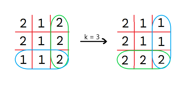 В первом наборе входных данных можно выполнить \(1\) операцию с \(k = 3\). Матрица будет преобразована следующим образом: