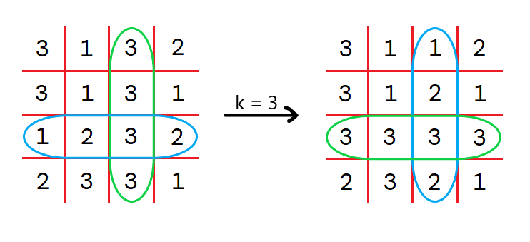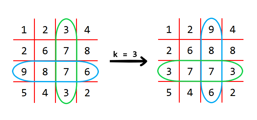 Например, для \(n = 4\) и \(k = 3\) матрица будет преобразована следующим образом:
