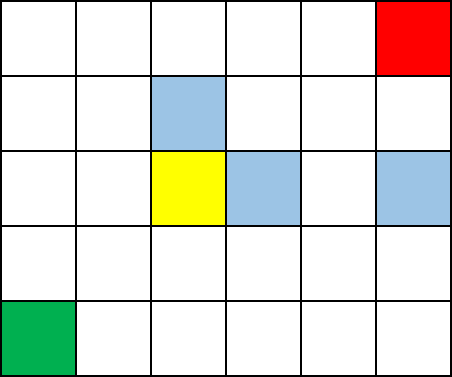 Стартовая клетка фишки имеет зелёный цвет, единственная клетка, из которой нельзя сделать ход — красный. Если фишка находится в жёлтой клетке, то голубые клетки — это все варианты того, куда её можно сдвинуть за один ход. Выходные данные