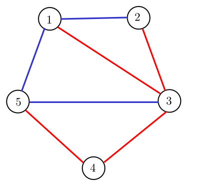 Давайте скажем, что мы красим некоторые рёбра в красный и оставшиеся рёбра в синий. Теперь рассмотрим только красные рёбра и посчитаем количество компонент связности в графе. Пусть это значение равно \(c_1\). Аналогично, рассмотрим только синие рёбра и посчитаем количество компонент связности в графе. Пусть это значение равно \(c_2\).
