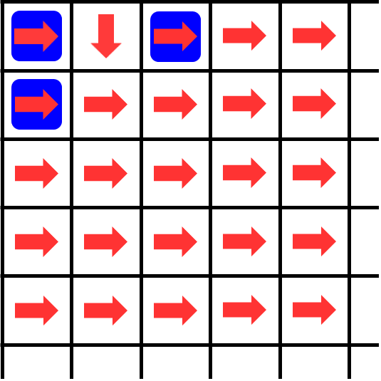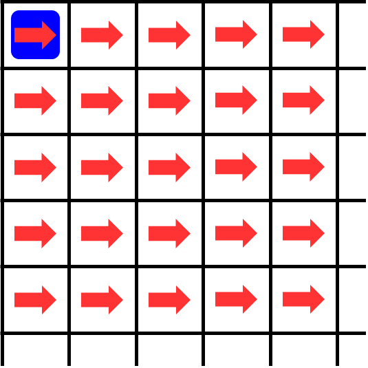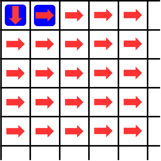 Есть конвейер со \(120\) строками и \(120\) столбцами. Каждая строка и столбец пронумерованы от \(0\) до \(119\), а ячейка в \(i\)-й строке и \(j\)-й столбце обозначена как \((i, j)\). Самая верхняя левая ячейка обозначается \((0, 0)\). Каждая ячейка имеет маленькую конвейерную ленту, и изначально лента в каждой ячейке направлена вправо.