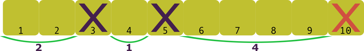 - Рабочие отрезки, оказавшиеся между выходными должны быть наименее похожи друг на друга. Более конкретно, если отрезки имеют длину \(l_1\), \(l_2\) и \(l_3\) дней, вы хотите максимизировать \(\min(|l_1 - l_2|, |l_2 - l_3|, |l_3 - l_1|)\).