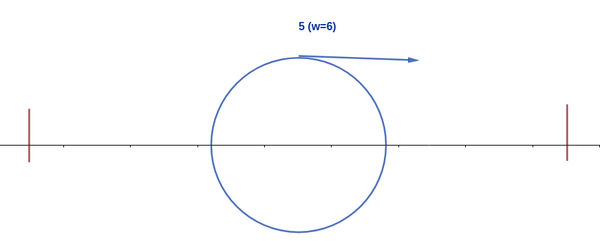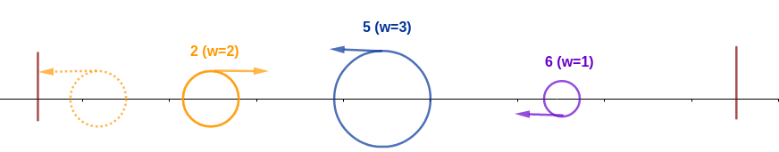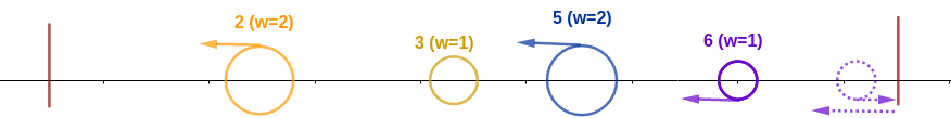 Через некоторое время муравей с индексом \(2\) (идущий влево) встретится с муравьем с индексом \(1\) (идущий вправо). Два муравья имеют одинаковый вес, поэтому муравей \(2\) съест муравья \(1\) и будет иметь вес \(2\). То же самое произойдет с муравьем \(5\) и муравьем \(4\).