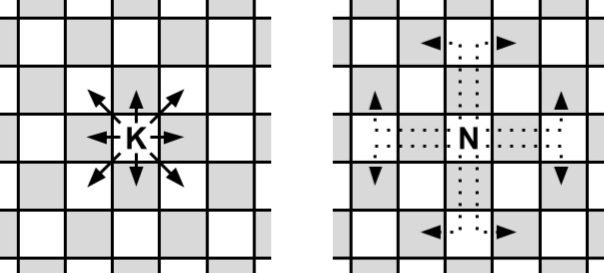 King and knight possible moves, respectively. Dotted line shows that knight can jump over other pieces.