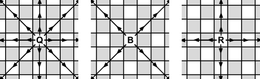Below are the movement rules. Note that the pieces (except for the knight) cannot jump over other pieces.
