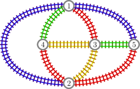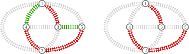 If we consider, for example, only companies \(2\) and \(3\), we can see that from any city it is possible to reach every other city (picture on the left below). However, if we restrict to company \(2\) alone, it becomes impossible to reach city \(5\) from city \(1\) (picture on the right).