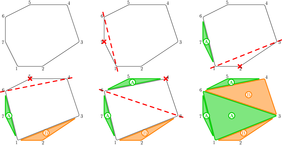 \(\) \begin{array}{|c|c|c|} \hline \textbf{Contestant} & \textbf{Judge} & \textbf{Explanation} \\ \hline \texttt{Beatrice} & & \text{The contestant will help Beatrice} \\ \hline & \texttt{7} & \text{Alberto eats the triangle with vertices $6$, $7$, $1$ and area $1$} \\ \hline \texttt{2} & & \text{Beatrice eats the triangle with vertices $1$, $2$, $3$ and area $2$} \\ \hline & \texttt{5} & \text{Alberto eats the triangle with vertices $4$, $5$, $6$ and area $1.5$} \\ \hline \texttt{4} & & \text{Beatrice eats the triangle with vertices $3$, $4$, $6$ and area $8$} \\ \hline & \texttt{6} & \text{Alberto eats the triangle with vertices $3$, $6$, $1$ and area $11$} \\ \hline \end{array} \(\) The total area eaten by Alberto is \(13.5\) and the total area eaten by Beatrice is \(10\), which is less than half the area of the whole pizza. The actions performed by the contestant and the judge in this example of interaction may be non-optimal. The process is illustrated below:
