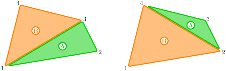 In the first sample, the pizza has area \(15\). Alberto can eat less than half of the pizza by eating the slice around vertex \(2\) (which has area \(6.5\)) or around vertex \(3\) (which has area \(3.5\)).