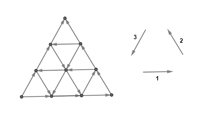 Деревня имеет вид равностороннего треугольника, ограниченного тремя дорогами длины \(n\). Она разделена на \(n^2\) меньших равносторонних треугольников со стороной \(1\) с помощью \(3n-3\) дополнительных дорог, параллельных сторонам, см. рисунок для \(n=3\). Каждая из \(3n\) дорог состоит из нескольких (возможно, \(1\)) участков дороги длины \(1\), соединяющих соседние перекрестки.