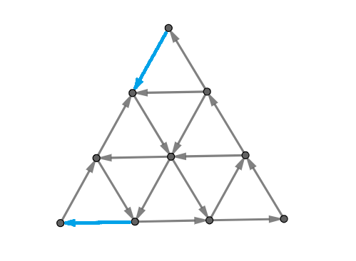 Первый пример показан на рисунке в условии. Существует несколько решений, изменяющих направление на ровно \(2\) участках дорог, но изменение направления только на \(1\) участке дороги не может привести к тому, что от каждого перекрестка можно добраться до любого другого. Одно из возможных решений показано на рисунке ниже, измененные участки дорог показаны синим.